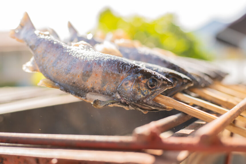 炭火で焼くあまごは余分な水分が抜けてとても香ばしく焼きあがります。