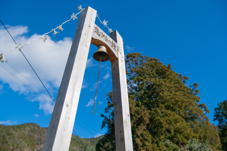 縁結びの村くのわき地区に入る際には、「初めまして」「ただいま」「良縁の祈り」など自由な想いで是非鐘を鳴らしてみてください。